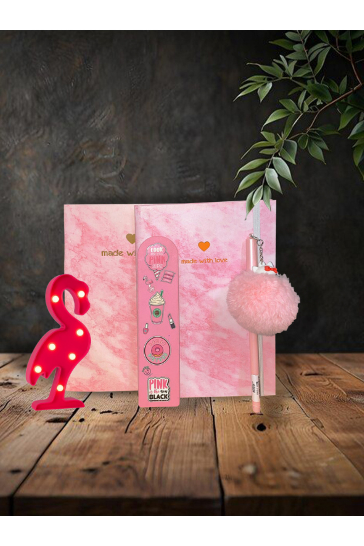 Mermer Desenli Sert Kapaklı Defter,Not Defteri,Pembe Hello Kity Ponponlu Kalem,Flamingo Led Işık